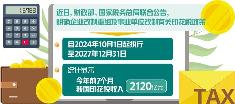 近日,财政部、国家税务总局联合公告,明确企业改制重组及事业单位改制有关印花税政策,自2024年10月1日起执行至2027年12月31日。