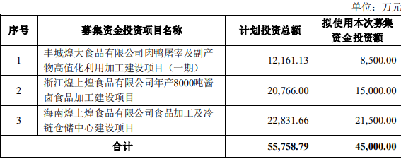本次非公开发行股票拟募集资金总额预计不超过45000.00万元(含本数),扣除发行费用后全部用于丰城煌大食品有限公司肉鸭屠宰及副产物高值化利用加工建设项目(一期)、浙江煌上煌食品有限公司年产8000吨酱卤食品加工建设项目及海南煌上煌食品有限公司食品加工及冷链仓储中心建设项目。